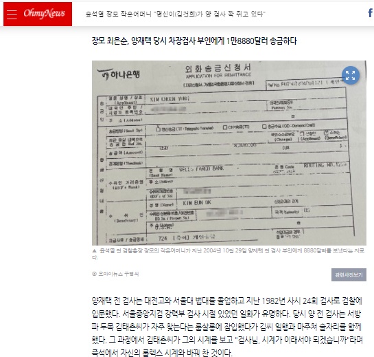 또한 송금받은 이는 영문명 'KIM E** O*'으로 양 전 검사의 부인이다. 당시 부인은 미국에서 두 아들의 유학을 뒷바라지하고 있었다. 윤 전 총장의 장모 가족이 양 전 검사 부인에게 총 1만 8,880달러를 송금한 것이다."