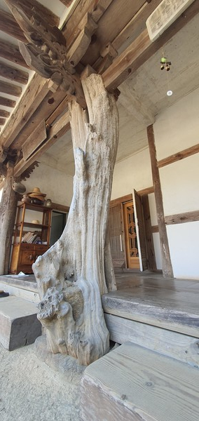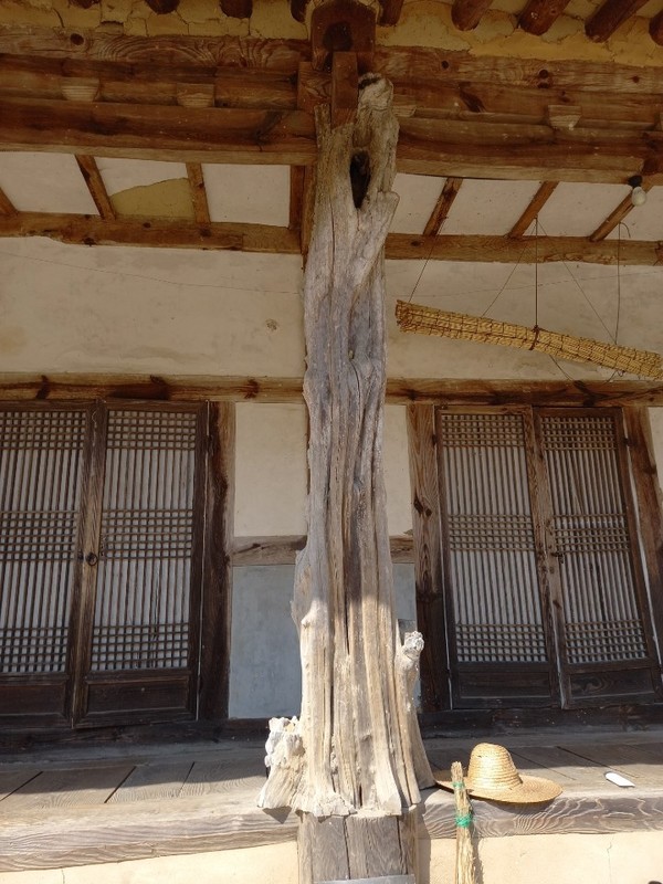 백년은 족히 넘었음직한 굵은 기둥들이었다. 그것도 전혀 다듬지 않고 살아있을 때 생긴 모습 그대로 사용했다.※ 나뭇가지의 흔적뿐 아니라, 움푹 팬 나뭇결, 옹이까지도 생생했다. 세월의 흔적으로 갈라지고 튼 모습이었다.