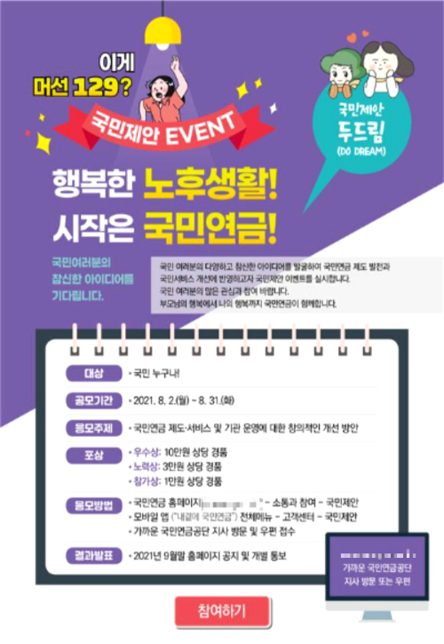 국민연금공단은 국민과 함께 행복한 노후를 위한 연금제도를 만들기 위한 '국민제안 이벤트(Do Dream)'를 오는 31일까지 실시한다. 대한민국 국민이면 누구나 참여할 수 있으며 주제는 '국민연금 제도, 서비스 및 기관운영' 분야다.