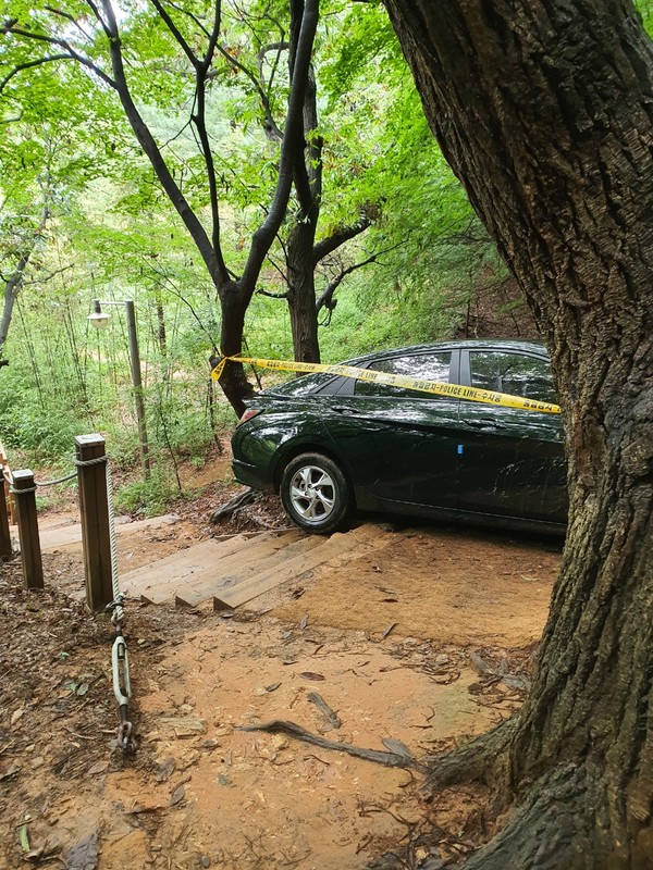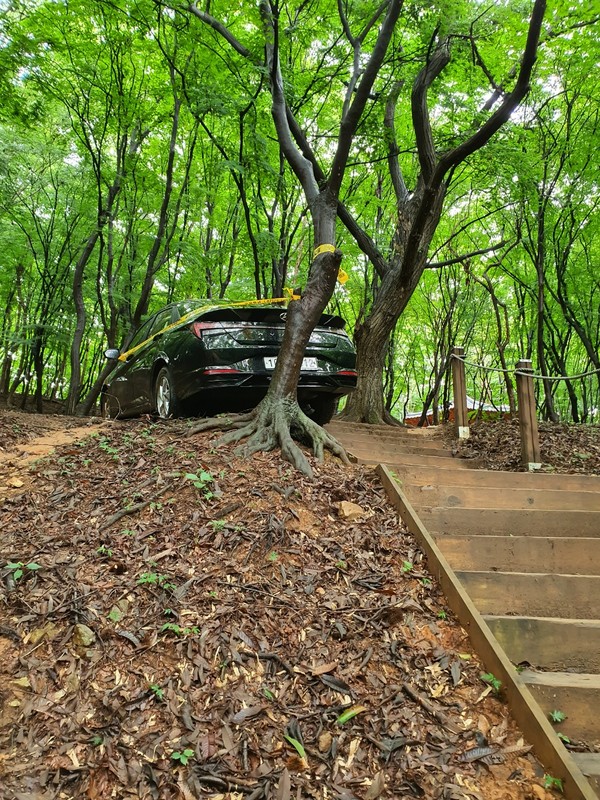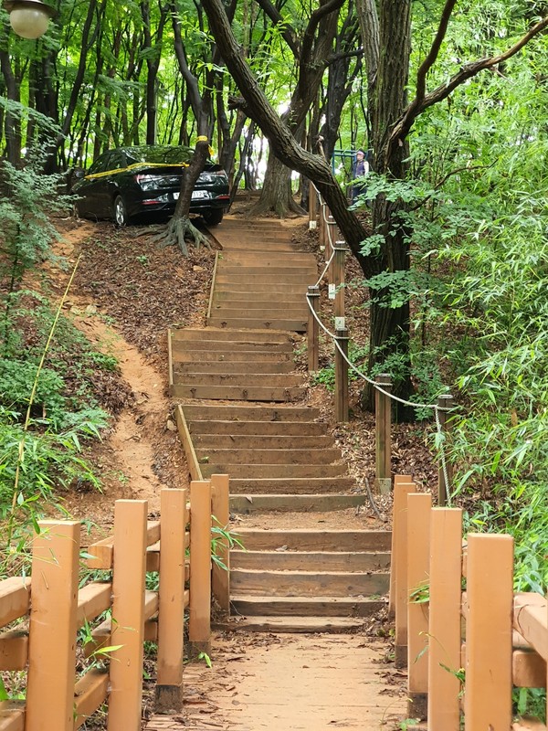 아침 저녁으로 많은 시민들이 등산을 위해 지나는 계단이다. 그런데 비가 집중적으로 내리던 지난 주말부터 이 곳에 차량이 그대로 방치돼 오가는 등산객들이 불안해하고 있다.