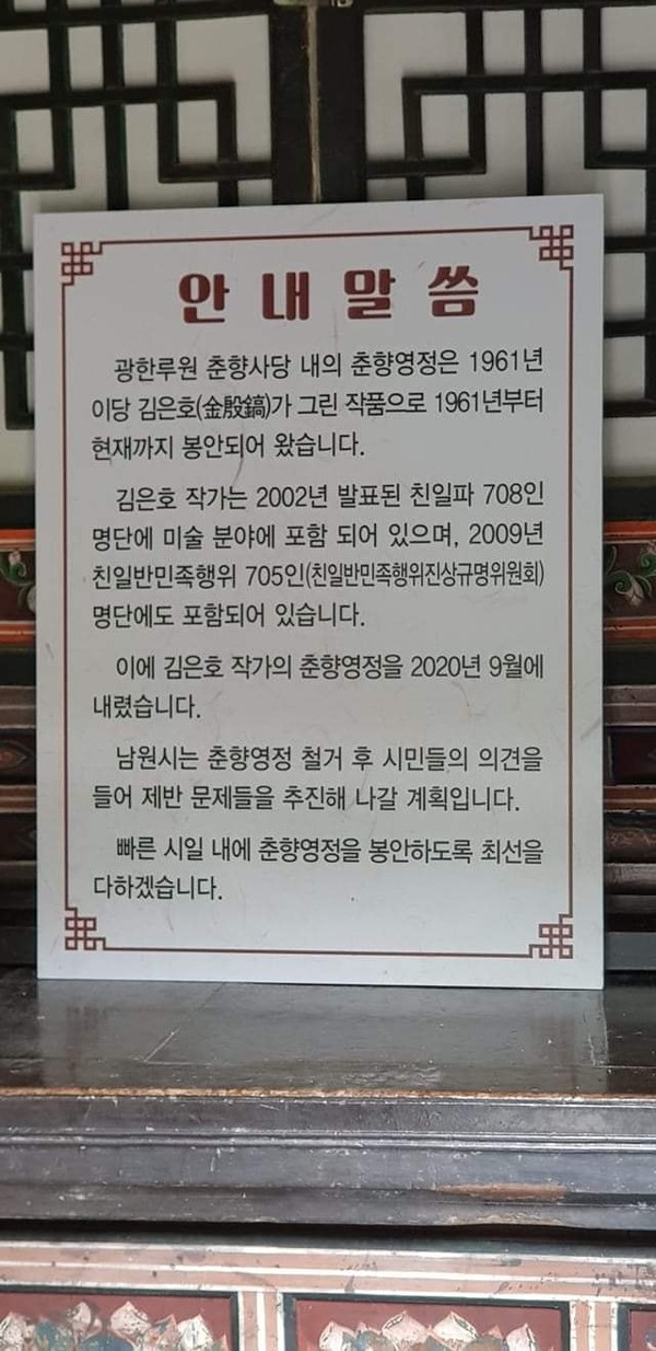 무어라고 말해 주어야 할까? 잠시 달나라로 휴가 가셨다고 했다. 역대 미스 춘향이가 모두 춘향이듯 조선 백성들의 마음 속에는 각자의 춘향이가 살아왔다 그중 사당에 들인 춘향 영정의 정체성에 불이 난 모양이다.