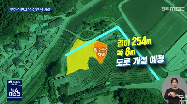 그러나 이상한 점은 또 있었다. 방송은 이날 기사에서 “장 군수가 새로 산 땅에 집을 짓고 난 직후인 지난해 7월 장수군은 군수의 집 바로 옆에 2차선 도로를 개설하겠다고 고시했다”며 “주변에 민가가 거의 없어 30년 가까이 도시 계획도에서 잠을 자던 도로 계획이 장 군수가 땅을 사고 집을 짓자마자 일사천리로 진행된 것”이라고 특혜 의혹을 제기했다.