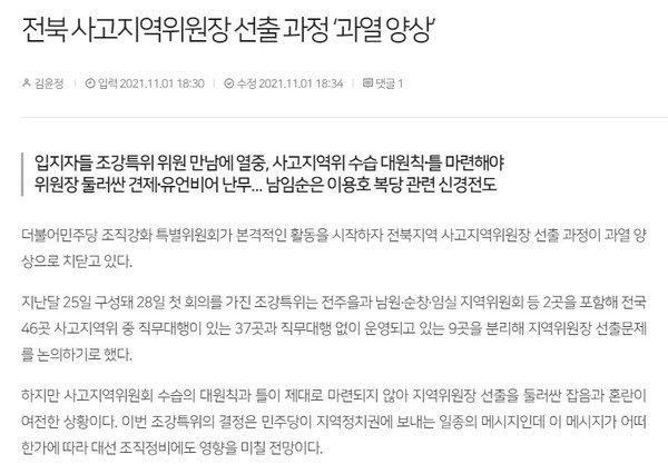 그러면서 “전주을의 경우 지난 총선 당시 전주을 경선 후보였던 이덕춘 변호사와 양경숙 국회의원(비례), 김희수·이병철 전북도의원에 더해 김이재 도의원과 고종윤 변호사까지 지역위원장에 뜻을 두고 있는 것으로 파악됐다”고 밝힌 기사는 “여기에 전 전주을 지역위원장이었던 무소속 이상직 의원이 보석으로 출소하면서 그의 행보에도 이목이 쏠리고 있다”며 “지역정치권 일각에선 이 의원이 자신의 지역구였던 전주을 지역의 ‘특정 도의원’을 염두에 두고 있다는 이야기도 흘러나오고 있다”고 덧붙였다.