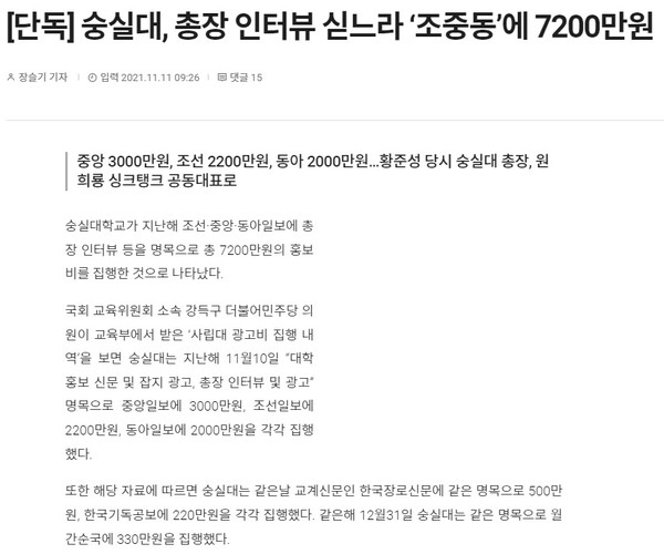 기사는 ”국회 교육위원회 소속 강득구 더불어민주당 의원이 교육부에서 받은 ‘사립대 광고비 집행 내역’을 보면 숭실대는 지난해 11월 10일 ‘대학 홍보 신문 및 잡지 광고, 총장 인터뷰 및 광고’ 명목으로 중앙일보에 3,000만원, 조선일보에 2,200만원, 동아일보에 2,000만원을 각각 집행했다“고 보도했다.