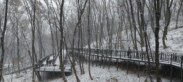 오후에 눈이 올 것 같아 눈 마중을 나왔는데 마침 눈이 내려줍니다. 하늘에서 내리는 눈은 그저 자연현상일 뿐인데 우리들 가슴에 그리움이 남아 있어서 그런지 하얗게 내리는 눈이 우리를 설레게 합니다. 특히 첫눈은 순결해서 축복의 느낌마저 들게 합니다.