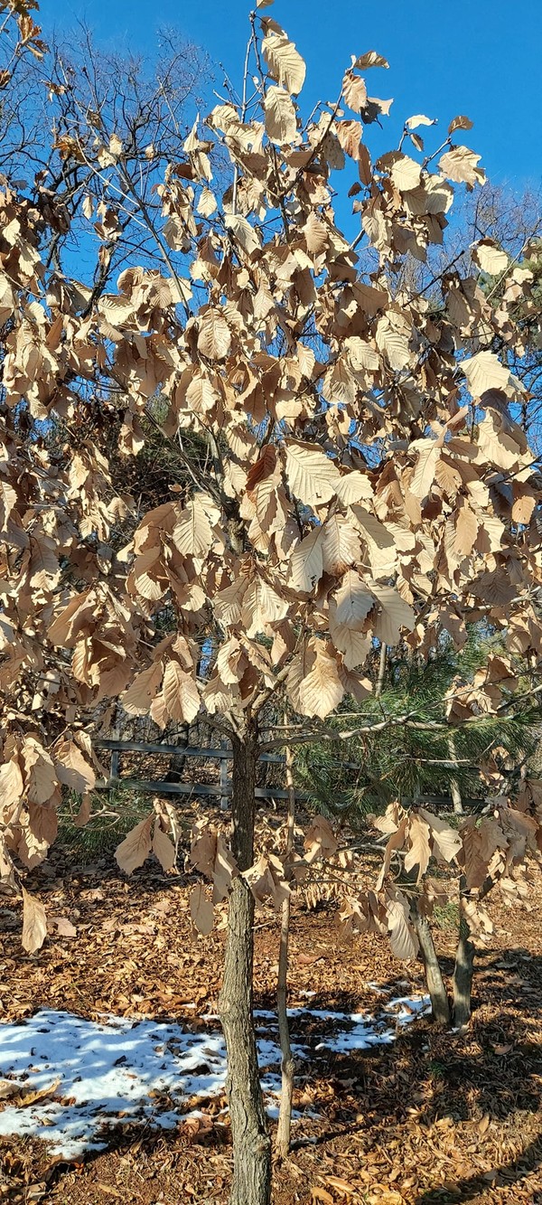 요즘 숲에는 낙엽이 지고 난 앙상한 나무들이 많아 나뭇가지 사이로 푸른 하늘을 즐길 수 있는데, 한겨울에도 아직 크고 누런 잎을 달고 있는 나무들이 보이는데 대부분 떡갈나무나 상수리나무로 참나무 종류라고 합니다.