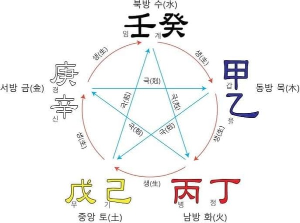 오행에는 오색이 따르고 방위가 따르는데, 중앙과 사방을 기본으로 삼아 황(黃)은 중앙, 청(靑)은 동, 백(白)은 서, 적(赤)은 남, 흑(黑)은 북을 뜻합니다. 그러니 환갑이 될 때까지 60갑자에서 다섯 번씩 나오는 모든 띠에는 각자 5가지 색의 동물이 있습니다(12가지 동물 × 5가지 색 = 60갑자).