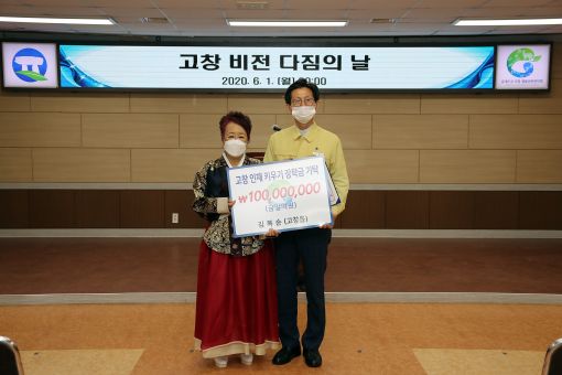 고창군 고창읍에 사는 김복순(70세) 할머니가 1일 고창군장학재단을 찾아 유기상 이사장에게 훌륭한 학생을 키우는 데 써달라며 1억원의 장학금을 전당했다.