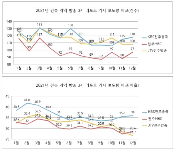 2021년 전북 지역방송 3사 보도량은 리포트 기사 3,970개(33.2%), 단신 기사 7,985개(66.8%)로 총 11955건이다. 각 방송사별로 살펴보면 다음과 같다.