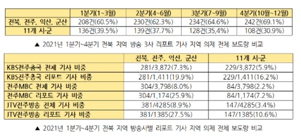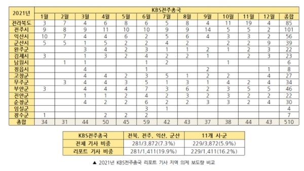'전북민언련, 2021년 종합 전북 방송 3사 시·군 의제 보도 실태 보고서' 결과 분석