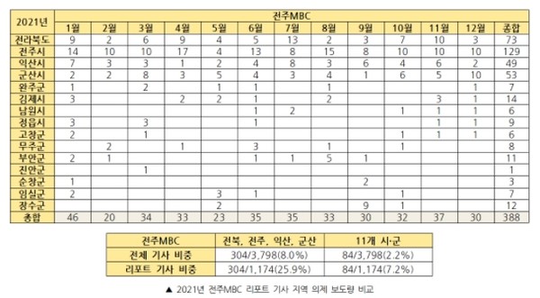전주MBC의 경우 2021년 1년 동안 전주시 관련 리포트 기사가 129건으로 가장 많았고, 진안군 관련 리포트 기사가 단 1건으로 세 방송사를 통틀어 가장 적은 것으로 나타났다.