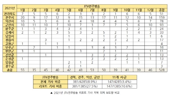 JTV전주방송의 경우 2021년 1년 동안 전주시 관련 리포트 기사가 159건으로 세 방송사를 통틀어 가장 많았고, 장수군 관련 리포트 기사가 3건으로 가장 적은 것으로 나타났다. 또한 2021년 7월부터 <신문 돋보기> 보도로 지역 풀뿌리 주간지와 마을신문, 대학신문 소식을 전달하는 보도를 시작하여, 7월부터 진안군과 순창군 관련 보도 건수가 눈에 띄게 증가하였다.