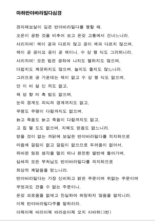 원효 스님께서 일반 대중에게 설한 반야심경은 한국불교에서는 저급하다고 생각해서 그런지 어디에도 내놓고 있지 않은데 10여년 전에 입적하신 청웅 스님의 법문을 듣고 저도 알아서 페북에 올리는 겁니다. 인터넷에서 검색을 해도 나오지 않은 경문입니다.