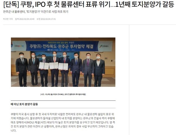 이어 이달 4일 서울 언론인 SBS Biz가 ‘쿠팡, IPO 후 첫 물류센터 표류 위기…1년째 토지분양가 갈등’이란 제목의 기사를 내보내면서 다시 주목을 끌었다. 그러자 전북일보도 9일 ‘쿠팡㈜, 완주에 대규모 물류센터 착공 지지부진’이란 제목의 기사와 10일 ‘쿠팡 완주첨단물류센터 건립 무산시킬 텐가’에서 문제 지적에 가세했다.