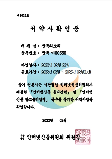 이에 따라 <전북의소리>는 인터넷신문위원회의 자율규제 참여를 통해 언론의 사회적 책무를 다하고 인터넷신문위원회의 윤리강령과 심의 결정을 준수하는 한편, 독자의 고충처리에 긴밀하게 협조하는 등 자율규제를 통해 서약사로서의 품위 및 신뢰 제고에 기여할 방침이다.
