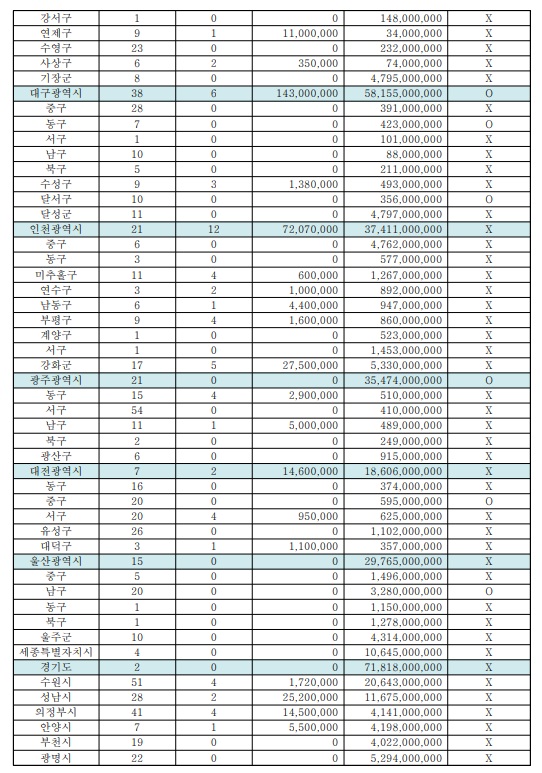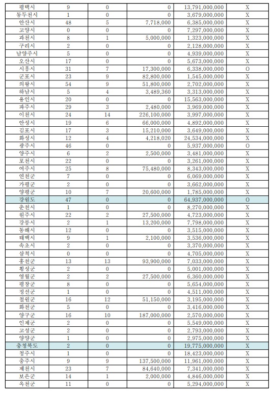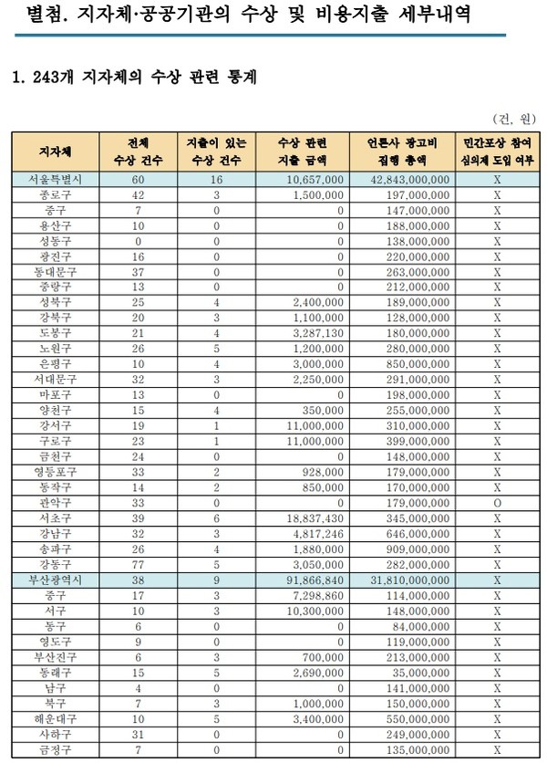 ※ 위 기사는 경실련이 2019년 11월 발표한 '지자체·공공기관, 언론사·민간단체에 상 받고 준 돈 5년간 93억 원' 자료를 참고하여 분석한 기사임(경실련의 세부 조사자료 표는 아래에 첨부)