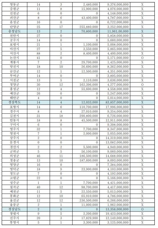 광역 지자체 단위로 살펴보면 경상북도가 광역과 기초 지자체 24곳 중 17곳이 120건의 상을 받고 약 14억 원의 돈을 지출해 다른 지자체에 비해 압도적으로 많았다. 이어 전라북도 7.2억 원, 경기도 6.3억 원, 충청북도 5.4억 원, 강원도 4억 원, 충청남도 3.7억 원으로 뒤를 이었다. 반면 울산광역시, 세종특별자치시, 제주특별자치도는 돈을 지출하는 상을 전혀 받지 않은 것으로 나타났다.