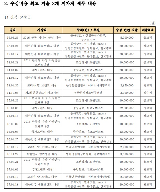 전북도는 도와 시군을 포함해 62건의 상을 받기 위해 7억 1,553만원의 혈세를 지출했다. 또한 전북도의 언론사 광고비 지출금액도 271억 9,800만원으로 인근 전남의 239억 4,700만원, 충남의 11억 9,610만원, 충북의 197억 7,500만원에 비해 많은 금액을 차지했다.(기사 맨 하단 별첨 표 자료 참고)