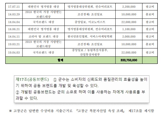 전국 243개 지자체 중 전북 고창군이 27건의 상을 받고 약 3억 3,375만 원의 돈을 지출했다. 고창군이 언론사에 지출한 광고금액은 52억 8,700만 원으로 나타나 다른 군지역들보다 두드러지게 높은 점이 특이하다.