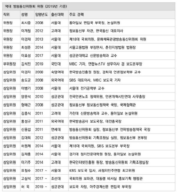 2007년 이후 임명된 방통위원의 출신대학과 직업경력을 조사한 결과, 1명을 제외하고는 모두 서울 소재 대학을 졸업한 인사였다. 18명의 위원 모두 중앙의 언론사나 법조계와 정치계 출신으로 지방에서 활동해온 인사는 전무했다.