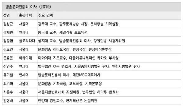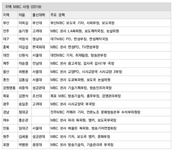 MBC 사장의 임면권을 가진 방송문화진흥회 이사회는 KBS 이사회와 마찬가지로 방송통신위원회가 임명한다. 2019년 기준 방문진 이사 9명의 학력과 경력을 보면, 지방대 출진자는 한 명도 없고, 대부분 서울에서 활동해온 중앙의 인사들이다.