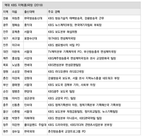 공영방송 이사 중에도 지방 출신 인사나 지역방송 출 신 인사를 찾기 힘들다. 11인으로 구성된 KBS 이사회 이사는 방송 법에 따라 각 분야의 대표성을 고려하여 방송통신위원회에서 추천하 고 대통령이 임명한다. 그러나 KBS 이사의 지역별 안배 규정은 존재하지 않는다.(한국의 KBS 이사회와 유사한 기능을 하는 일본 NHK 경영위원회의 경우, 위원의 지역별 안배를 법적으로 규정하고 있다).