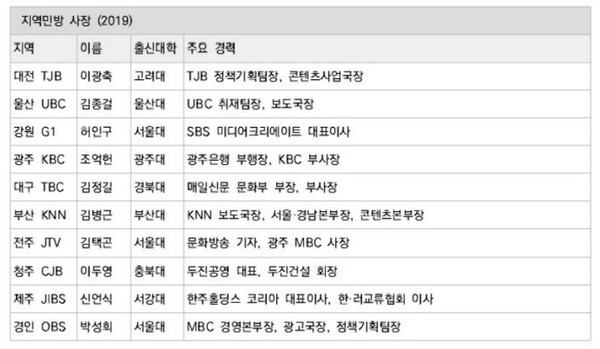 지역 MBC 사장은 16명 중 5명만이 지역방송사 경력자였다. 10개 지역민방 사장의 분포를 보면, 해당 지역민방에서 경력을 쌓고 사장으로 선임된 사람이 3명, 중앙방송사 출신이 3명, 방송 비경력자가 4명이었다. 한국의 방송산업의 중앙집중 구조는 방송권력을 중앙이 독점하고 있기에 가능하다. 한국 방송정책을 수립하는 방송통신위원회, 공영 방송의 이사회, 지상파 3사 사장 모두 철저하게 지방사람들을 배제 하고 있다.