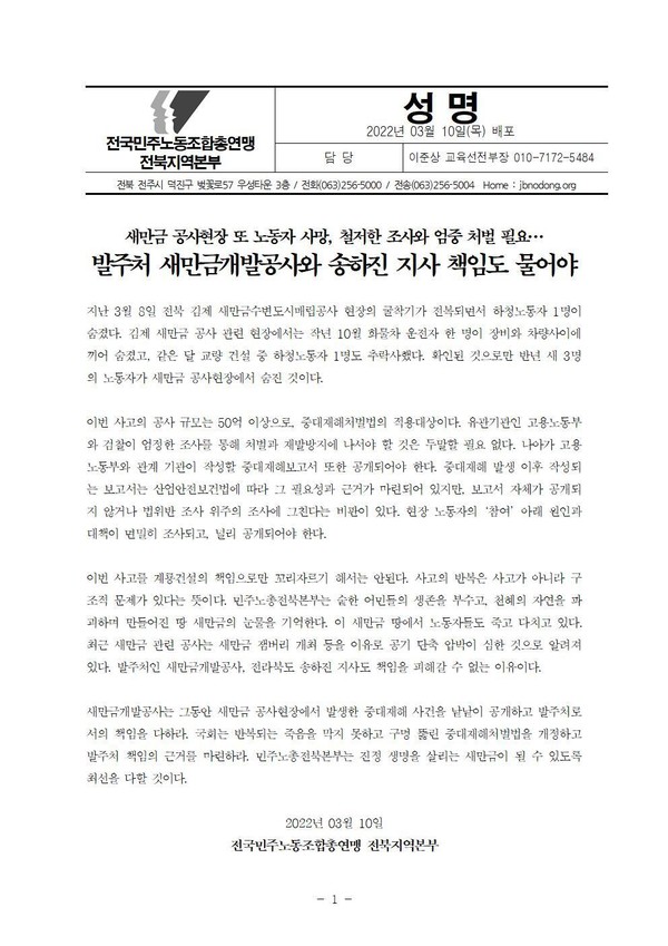 [민주노총전북본부 성명] 새만금 공사현장 노동자 사망, 중대재해보고서 공개하고 발주처 책임 물어야(3/10)