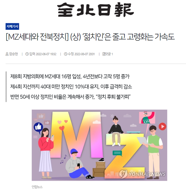 전북일보는 선거 전 [MZ 정치인을 만나다] 기획 보도를 통해 더불어민주당 신유정·김세혁(5/17), 국민의힘 한상욱·유은혜(5/18), 정의당 권하늘·진보당 최한별(5/19) 후보 등 MZ 세대 정치인을 조명하고 소개하는 보도를 했었죠. 선거 후에도 관련 보도를 이어갔습니다. MZ세대 정치인에 주목하면서도 한편으로는 이들 세대가 정치에 참여하기 어려운 사회적인 문제를 짚어보고 있습니다.