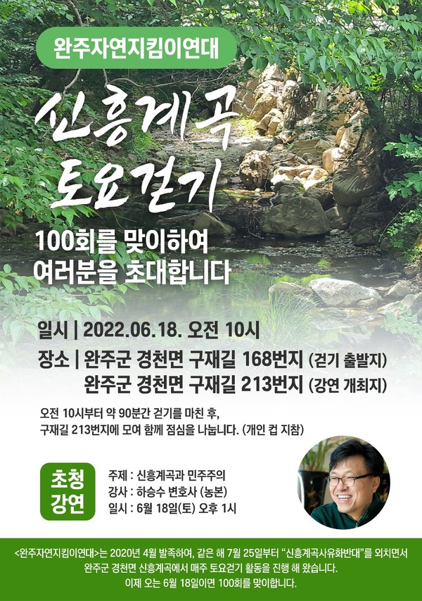완주자연지킴이연대 주최 '제100회 신흥계곡 사유화 반대 토요걷기' 및 ‘신흥계곡과 민주주의 강연'이 18일 오전 10시부터 오후 3시 30분까지 완주군 경천면 가천리 181번지 일대에서 진행된다.