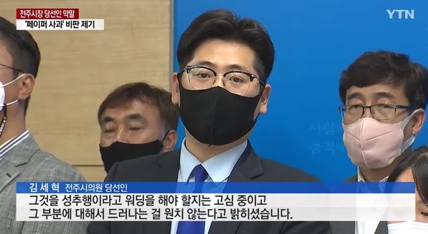 앞서 YTN은 24일 관련 보도에서 당시 상황을 증언한 김세혁 전주시의원 당선자의 말을 인용해 “마무리하고 인사하는 과정에서 불필요한 신체 접촉이 있었고 당사자가 그 부분에 대해서 불쾌감을 느꼈으나, 그 이후에 그것을 성추행이라고 워딩을 해야 할지는 고심 중이고 그 부분에 대해서 드러나는 것을 원치 않는다고 밝혔다”고 보도했다.