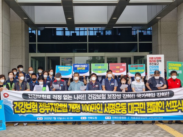 그러면서 단체는 ▲건강보험 정부지원 30%까지 확대 ▲건강보험 항구적 재정지원 법제화 ▲ 의료상업화·민영화 정책 폐기 ▲공공의료 확충과 건강보험 보장성 강화 정책 마련 ▲코로나19 감염병 지원비 중 보험 재정지출금 충당 등을 촉구했다.