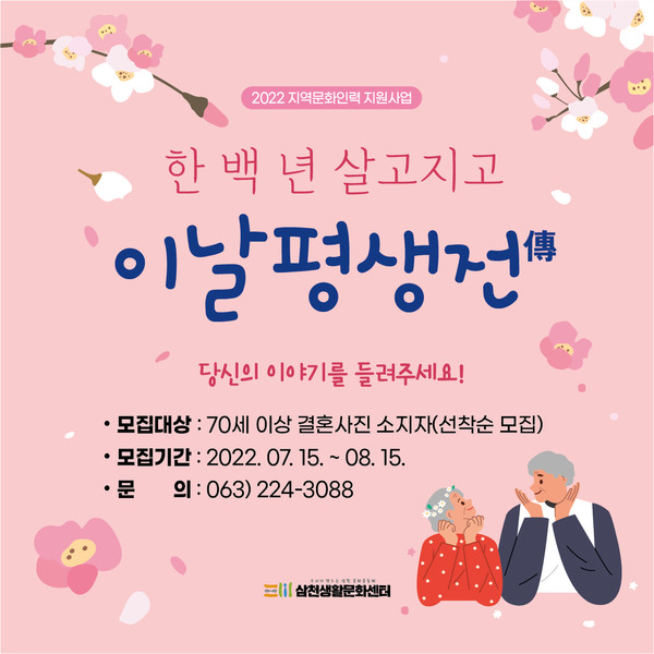 지방소멸의 시대에 새로운 시각으로 지역의 이야기를 풀어가는 삼천생활문화센터가 <한 백 년 살고지고 이날 평생 전(傳)>에 70세 이상 어르신들의 빛바랜 웨딩사진을 모집한다.