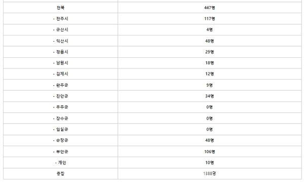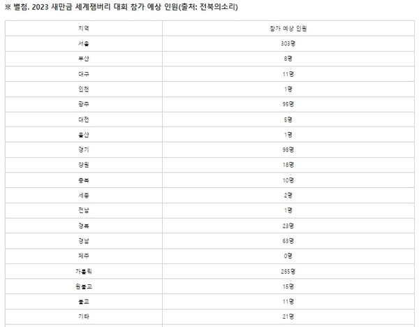 이 외에 서울은 308명, 경기 98명, 광주 95명 등으로 나타났지만, 제주 신청자는 0명, 인천‧전남‧울산에서는 각각 한 명, 세종 2명 등 지역별로 큰 차이를 보였습니다. 전북의소리는 “다른 지역에는 대회 홍보가 제대로 이뤄지지 않았음을 반영한 결과로 분석됐다.”라고 보도했습니다.