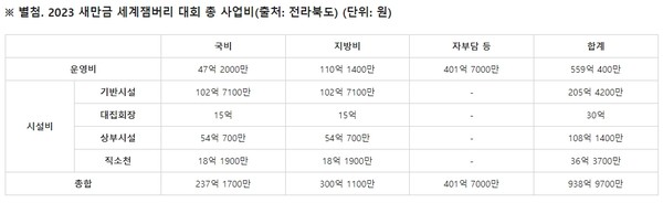 15일 전북의소리는 “새만금 잼버리 예산은 2020년 846억 원으로 확정됐지만, 그동안 100억 원가량 더 증가해 938억 9,700만 원(국비 237억 1,100만 원, 지방비 300억 1,100만 원, 자부담 등 401억 7,000만 원)의 예산이 투입되고 있다.”라며, 예산이 증가했다고 보도했습니다. 지출을 보면 시설비(379억 9,300만 원)보다 운영비(559억 400만 원)가 더 많습니다.