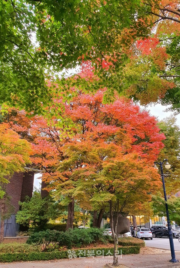 아름답게 물들어가는 교정의 단풍. 사색이 곱게 내려 앉은 전북대학교 캠퍼스의 저물어 가는 가을 오후 풍경을 담은 사진입니다.