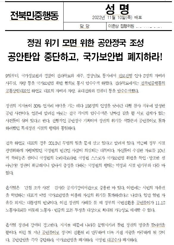 전북민중행동 등 전북지역 30개 시민사회단체들은 10일 ‘정권 위기 모면 위한 공안정국 조성, 공안탄압 중단하고, 국가보안법 폐지하라’는 공동성명을 내고 “9일부터 국가정보원과 경찰이 전라북도와 제주, 경상남도 등지에서 진보진영 인사 8명의 자택과 사무실, 차량 등을 국가보안법 위반 혐의로 동시 압수수색했다”면서 “전라북도에서는 전북민중행동의 공동상임대표인 하연호 대표의 자택과 차량, 휴대전화와 컴퓨터 등을 압수수색했다”고 밝혔다.